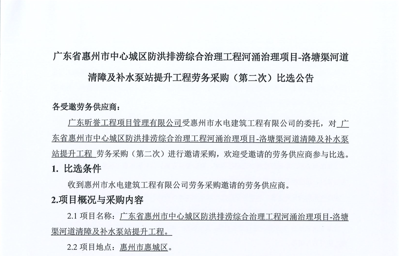 廣東省惠州市中心城區地下管網系統提升工程-內街小巷排水管網病害修復及錯混接改造項目一期施工勞務采購(第二次)中選候選人公示……
